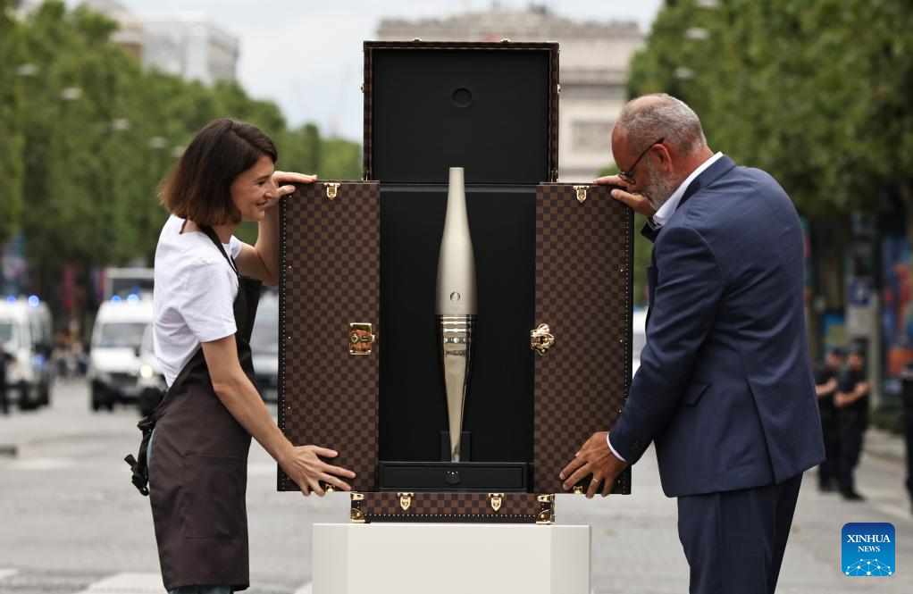 PARÍS, 14 julio, 2024 (Xinhua) -- Funcionarios de Louis Vuitton abren un baúl que contiene la antorcha olímpica, diseñada a medida y elaborada por Louis Vuitton, un socio de la marca LVMH para los Juegos Olímpicos y Paralímpicos de París, previo al Relevo de la Antorcha de los Juegos Olímpicos de París 2024, en París, Francia, el 14 de julio de 2024. (Xinhua/Gao Jing)