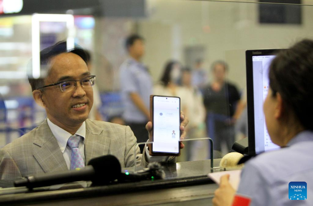 SHANGHAI, 13 julio, 2024 (Xinhua) -- Imagen del 12 de julio de 2024 de un hombre de apellido Chung, procedente de Singapur, presentando una visa electrónica emitida por la Oficina de Asuntos Gubernamentales de la Administración de Entrada y Salida del Buró de Seguridad Pública de Shanghai mientras pasa por los trámites fronterizos en el Aeropuerto Internacional Pudong de Shanghai, en Shanghai, en el este de China. La municipalidad de Shanghai ha emitido la primera visa electrónica de China, un paso importante para el país en la promoción del uso de visas electrónicas. La visa electrónica, también conocida como "e-visa", es la digitalización del tradicional visado en papel. La información de la visa se almacena digitalmente y se expide al solicitante en forma de documento electrónico, eliminando la necesidad de pegar una visa de papel en el pasaporte. En posesión de su pasaporte y su visa electrónica, el solicitante puede cruzar la frontera y permanecer en el país legalmente. (Xinhua/Wang Xiang)