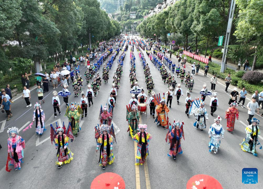 JIANHE, 13 julio, 2024 (Xinhua) -- Personas participan en la celebración del "Liuyueliu", un festival étnico, en el distrito de Jianhe de la prefectura autónoma de las etnias miao y dong de Qiandongnan, en la provincia de Guizhou, en el suroeste de China, el 13 de julio de 2024. La celebración anual del festival étnico "Liuyueliu" dura del 11 al 14 de julio aquí en el distrito de Jianhe. Una serie de actividades culturales se han llevado a cabo durante la celebración. (Xinhua/Yang Jiameng)
