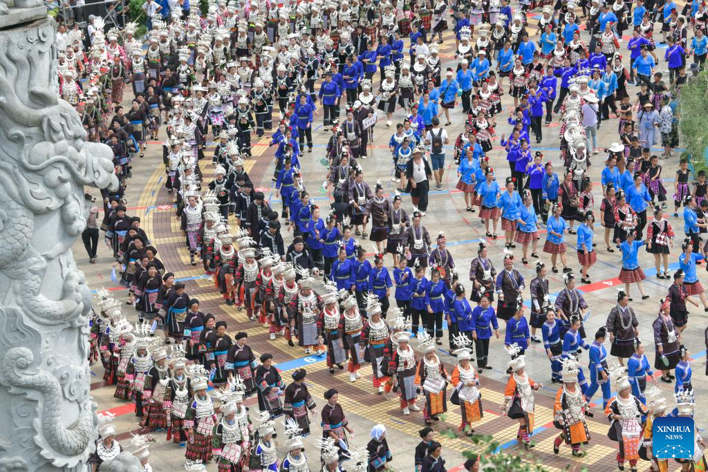JIANHE, 13 julio, 2024 (Xinhua) -- Personas participan en la celebración del "Liuyueliu", un festival étnico, en el distrito de Jianhe de la prefectura autónoma de las etnias miao y dong de Qiandongnan, en la provincia de Guizhou, en el suroeste de China, el 13 de julio de 2024. La celebración anual del festival étnico "Liuyueliu" dura del 11 al 14 de julio aquí en el distrito de Jianhe. Una serie de actividades culturales se han llevado a cabo durante la celebración. (Xinhua/Yang Wenbin)