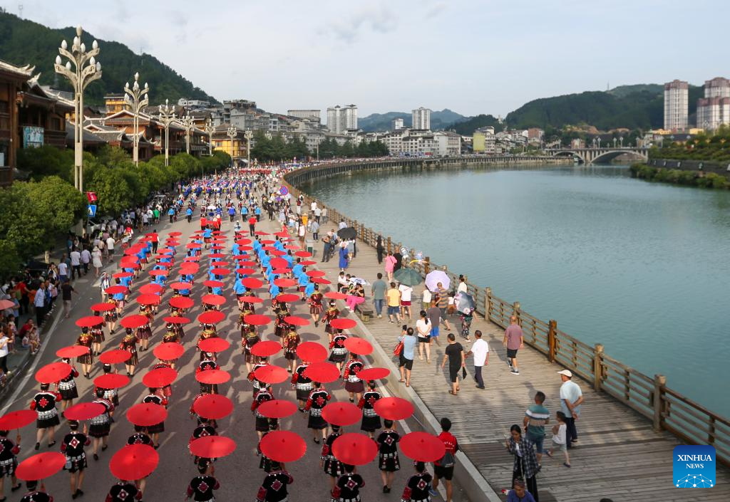 JIANHE, 13 julio, 2024 (Xinhua) -- Personas participan en la celebración del "Liuyueliu", un festival étnico, en el distrito de Jianhe de la prefectura autónoma de las etnias miao y dong de Qiandongnan, en la provincia de Guizhou, en el suroeste de China, el 13 de julio de 2024. La celebración anual del festival étnico "Liuyueliu" dura del 11 al 14 de julio aquí en el distrito de Jianhe. Una serie de actividades culturales se han llevado a cabo durante la celebración. (Xinhua/Wan Wenjie)