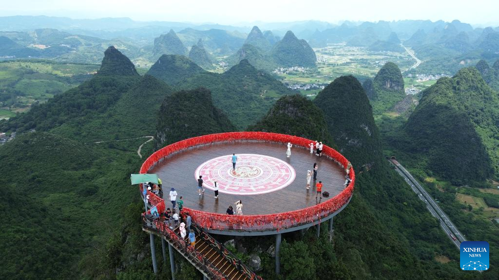 BEIJING, 14 julio, 2024 (Xinhua) -- Vista aérea tomada con un dron el 13 de julio de 2024 de turistas disfrutando el paisaje montañoso en una plataforma de observación, en el distrito de Yangshuo, en la ciudad de Guilin, en la región autónoma zhuang de Guangxi, en el sur de China. Muchos destinos turísticos a lo largo de China han visto recientemente un incremento en visitantes mientras el país entra a su temporada alta de turismo de verano. (Xinhua/Liao Zuping)