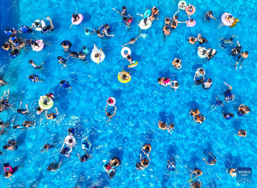 BEIJING, 14 julio, 2024 (Xinhua) -- Vista aérea tomada con un dron el 14 de julio de 2024 de personas refrescándose en un parque acuático, en el distrito de Daoxian, en la ciudad de Yongzhou, en la provincia de Hunan, en el centro de China. Muchos destinos turísticos a lo largo de China han visto recientemente un incremento en visitantes mientras el país entra a su temporada alta de turismo de verano. (Xinhua/Jiang Keqing)