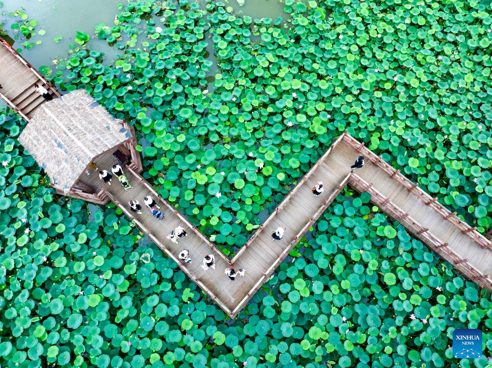 BEIJING, 14 julio, 2024 (Xinhua) -- Vista aérea tomada con un dron el 14 de julio de 2024 de turistas visitando un parque nacional de humedal, en la ciudad de Xinghua, en la provincia de Jiangsu, en el este de China. Muchos destinos turísticos a lo largo de China han visto recientemente un incremento en visitantes mientras el país entra a su temporada alta de turismo de verano. (Xinhua/Zhou Shegen)