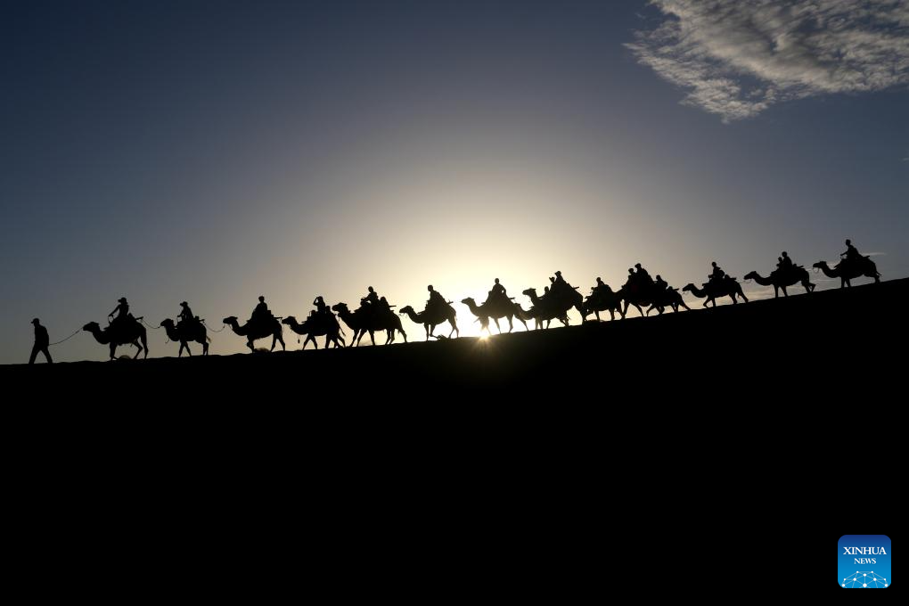 BEIJING, 14 julio, 2024 (Xinhua) -- Turistas montan camellos en el Mingshashan y el Lago de Creciente, un punto escénico de oasis en el Desierto de Gobi, en Dunhuang, en la provincia de Gansu, en el noroeste de china, el 14 de julio de 2024. Muchos destinos turísticos a lo largo de China han visto recientemente un incremento en visitantes mientras el país entra a su temporada alta de turismo de verano. (Xinhua/Zhang Xiaoliang)