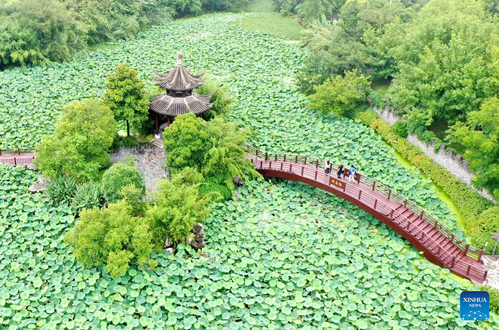 BEIJING, 14 julio, 2024 (Xinhua) -- Vista aérea tomada con un dron el 14 de julio de 2024 de turistas visitando un jardín, en el poblado de Dinghuo, en la ciudad de Yangzhou, en la provincia de Jiangsu, en el este de China. Muchos destinos turísticos a lo largo de China han visto recientemente un incremento en visitantes mientras el país entra a su temporada alta de turismo de verano. (Xinhua/Ren Fei)