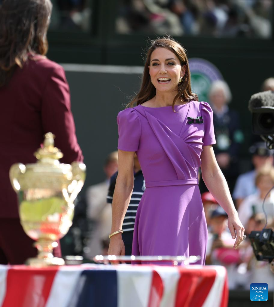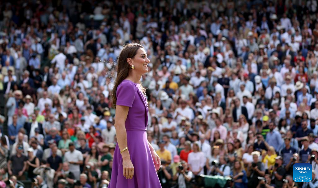 LONDRES, 15 julio, 2024 (Xinhua) -- Imagen del 14 de julio de 2024 de la princesa de Gales, Catalina, de Reino Unido, vista durante la ceremonia de premiación después del partido de la final de individuales masculinos entre Carlos Alcaraz, de España, y Novak Djokovic, de Serbia, en el Campeonato de Tenis de Wimbledon, en Londres, Reino Unido. (Xinhua/Li Ying)