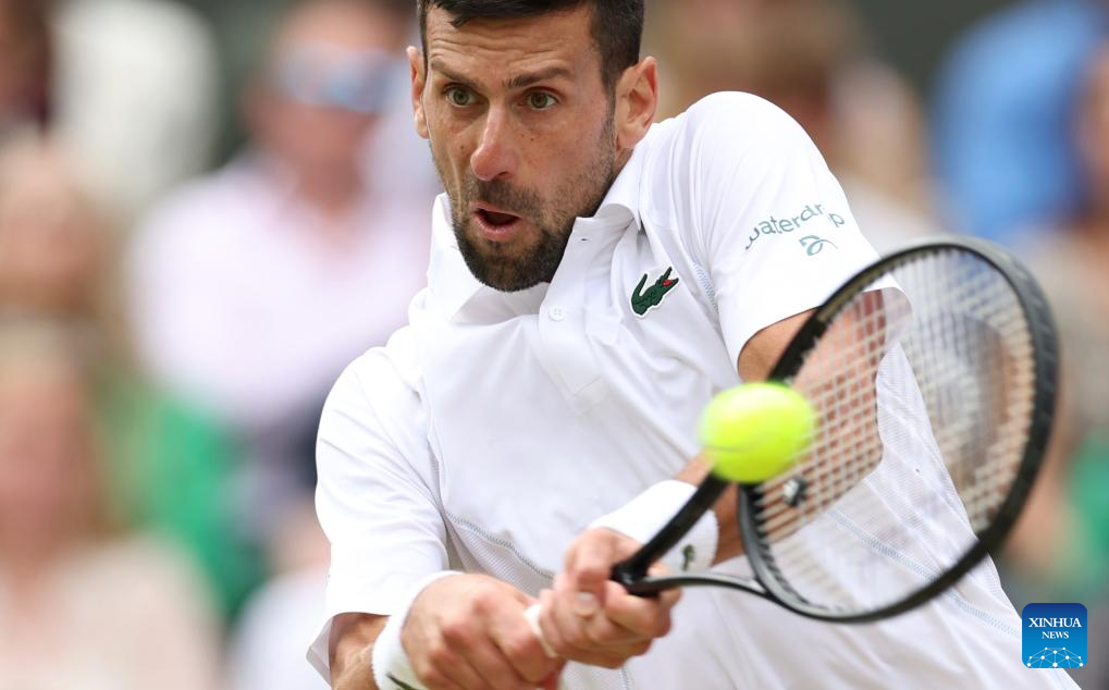 LONDRES, 15 julio, 2024 (Xinhua) -- Imagen del 14 de julio de 2024 de Novak Djokovic devolviendo la pelota durante el partido de la final de individuales masculinos entre Carlos Alcaraz, de España, y Novak Djokovic, de Serbia, en el Campeonato de Tenis de Wimbledon, en Londres, Reino Unido. (Xinhua/Li Ying)