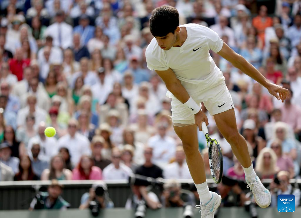 LONDRES, 15 julio, 2024 (Xinhua) -- Imagen del 14 de julio de 2024 de Carlos Alcaraz devolviendo la pelota durante el partido de la final de individuales masculinos entre Carlos Alcaraz, de España, y Novak Djokovic, de Serbia, en el Campeonato de Tenis de Wimbledon, en Londres, Reino Unido. (Xinhua/Li Ying)