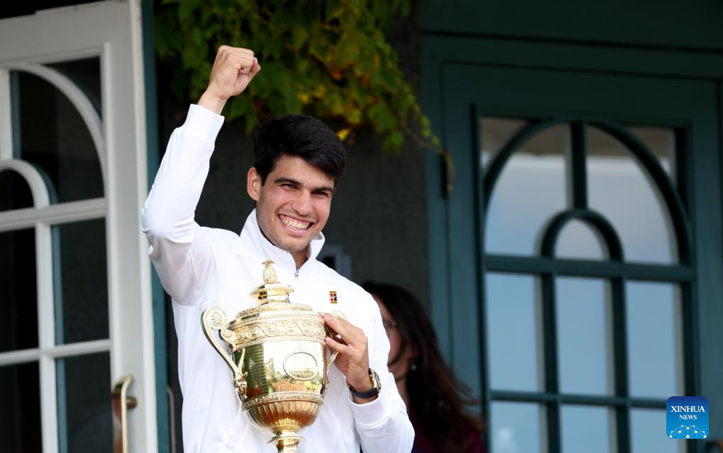 LONDRES, 15 julio, 2024 (Xinhua) -- Imagen del 14 de julio de 2024 de Carlos Alcaraz festejando con el trofeo después de ganar el partido de la final de individuales masculinos entre Carlos Alcaraz, de España, y Novak Djokovic, de Serbia, en el Campeonato de Tenis de Wimbledon, en Londres, Reino Unido. (Xinhua/Li Ying)