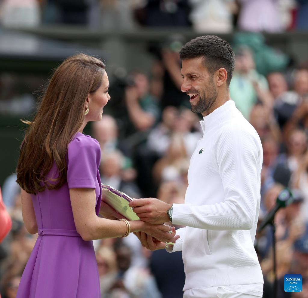 LONDRES, 15 julio, 2024 (Xinhua) -- Imagen del 14 de julio de 2024 de la princesa de Gales, Catalina (i) de Reino Unido, entregando el trofeo a Novak Djokovic durante la ceremonia de premiación después del partido de la final de individuales masculinos entre Carlos Alcaraz, de España, y Novak Djokovic, de Serbia, en el Campeonato de Tenis de Wimbledon, en Londres, Reino Unido. (Xinhua/Li Ying)