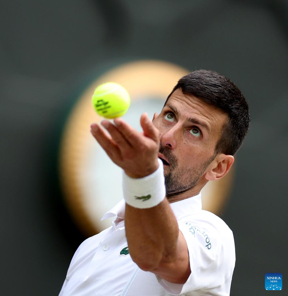 LONDRES, 15 julio, 2024 (Xinhua) -- Imagen del 14 de julio de 2024 de Novak Djokovic sirviendo la pelota durante el partido de la final de individuales masculinos entre Carlos Alcaraz, de España, y Novak Djokovic, de Serbia, en el Campeonato de Tenis de Wimbledon, en Londres, Reino Unido. (Xinhua/Li Ying)
