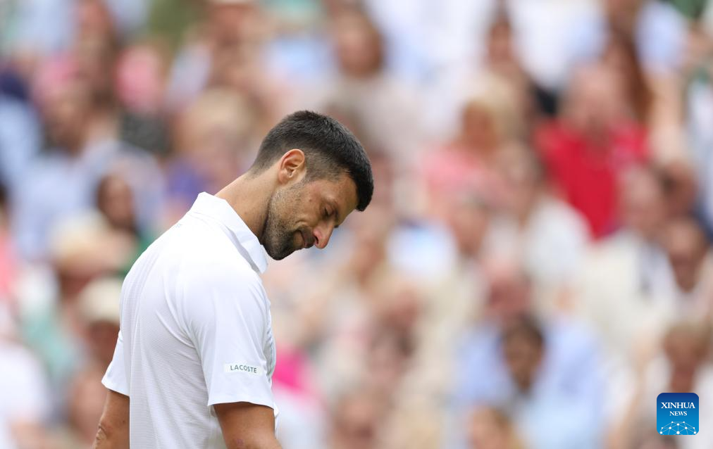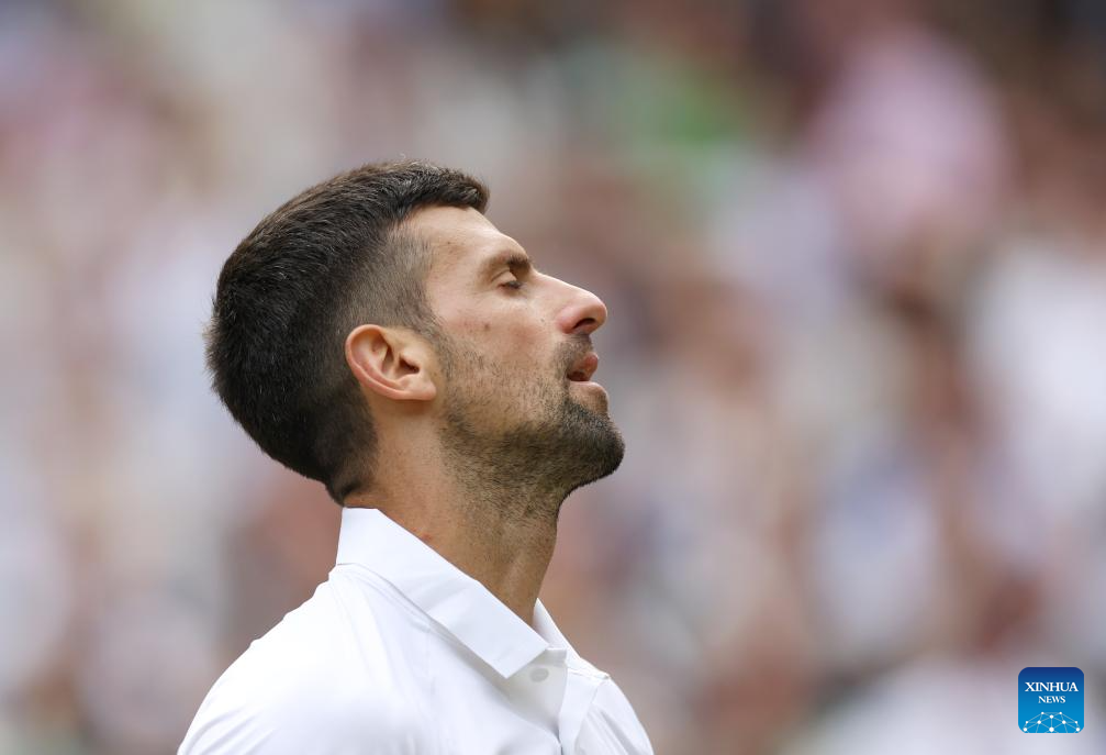 LONDRES, 15 julio, 2024 (Xinhua) -- Imagen del 14 de julio de 2024 de Novak Djokovic reaccionando durante el partido de la final de individuales masculinos entre Carlos Alcaraz, de España, y Novak Djokovic, de Serbia, en el Campeonato de Tenis de Wimbledon, en Londres, Reino Unido. (Xinhua/Li Ying)