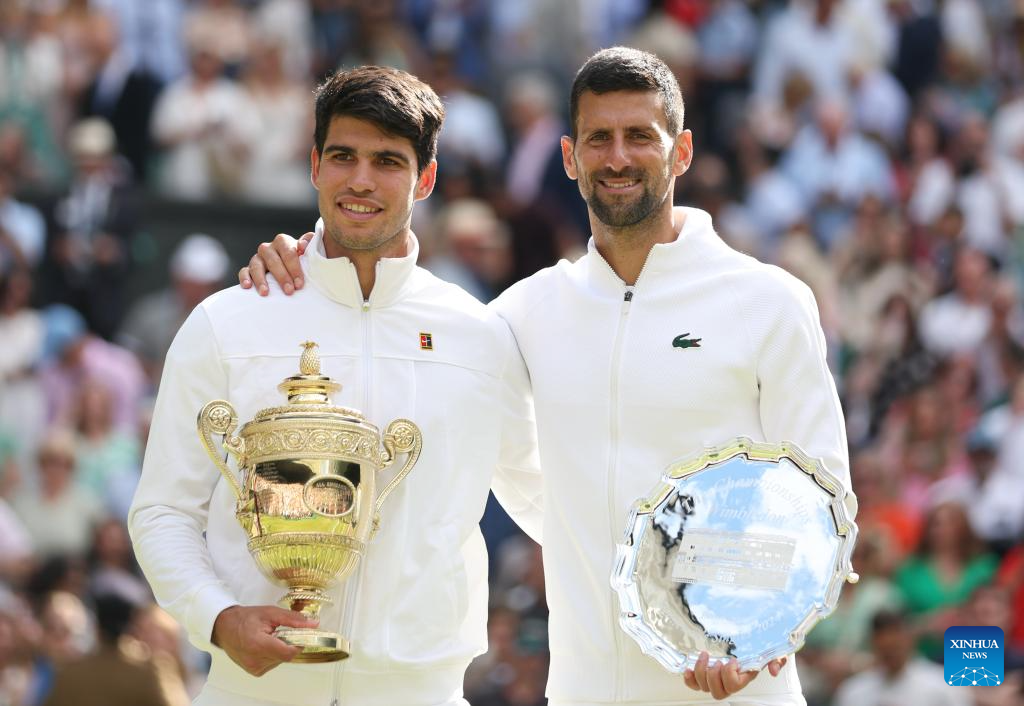 LONDRES, 15 julio, 2024 (Xinhua) -- Imagen del 14 de julio de 2024 de Carlos Alcaraz (i) posando para fotografías con Novak Djokovic en el podio después del partido de la final de individuales masculinos entre Carlos Alcaraz, de España, y Novak Djokovic, de Serbia, en el Campeonato de Tenis de Wimbledon, en Londres, Reino Unido. (Xinhua/Li Ying)