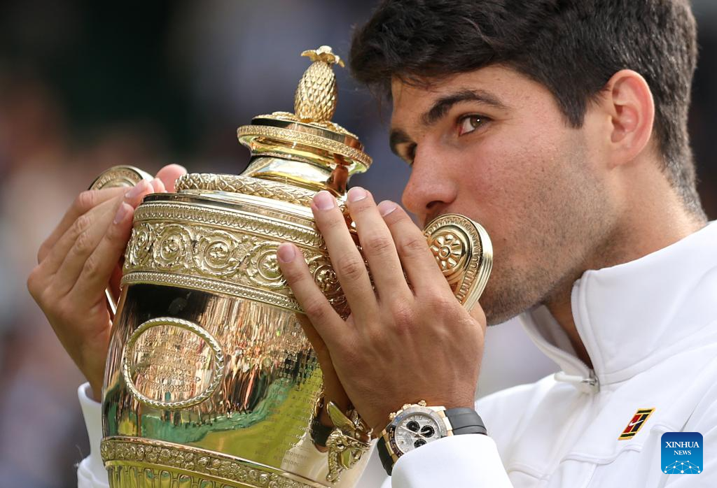 LONDRES, 15 julio, 2024 (Xinhua) -- Imagen del 14 de julio de 2024 de Carlos Alcaraz besando el trofeo después de ganar el partido de la final de individuales masculinos entre Carlos Alcaraz, de España, y Novak Djokovic, de Serbia, en el Campeonato de Tenis de Wimbledon, en Londres, Reino Unido. (Xinhua/Li Ying)