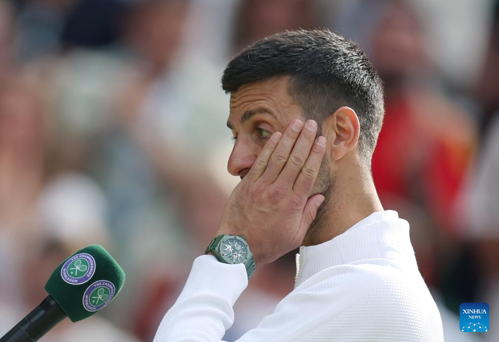 LONDRES, 15 julio, 2024 (Xinhua) -- Imagen del 14 de julio de 2024 de Novak Djokovic reaccionando mientras es entrevistado después del partido de la final de individuales masculinos entre Carlos Alcaraz, de España, y Novak Djokovic, de Serbia, en el Campeonato de Tenis de Wimbledon, en Londres, Reino Unido. (Xinhua/Li Ying)