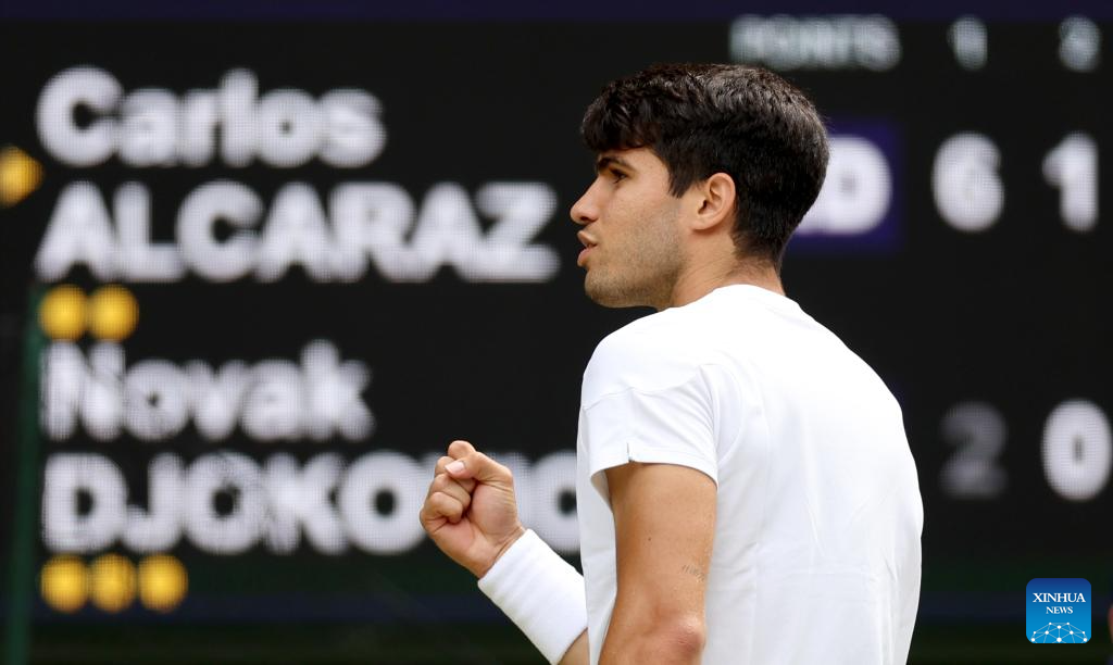 LONDRES, 15 julio, 2024 (Xinhua) -- Imagen del 14 de julio de 2024 de Carlos Alcaraz festejando una anotación durante el partido de la final de individuales masculinos entre Carlos Alcaraz, de España, y Novak Djokovic, de Serbia, en el Campeonato de Tenis de Wimbledon, en Londres, Reino Unido. (Xinhua/Li Ying)