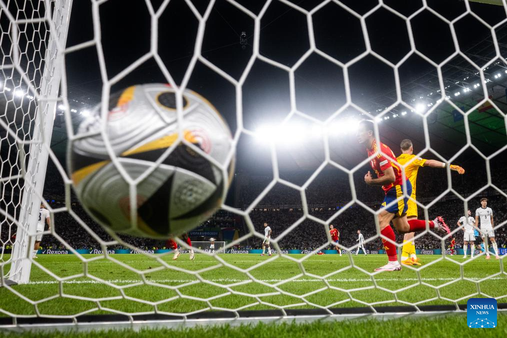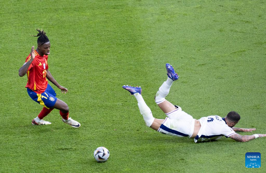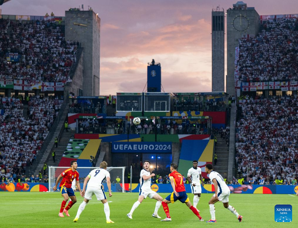 BERLIN, 15 julio, 2024 (Xinhua) -- Imagen del 14 de julio de 2024 de jugadores compitiendo durante el partido correspondiente a la final de la EURO 2024 de la UEFA, entre Inglaterra y España, en Berlín, Alemania. (Xinhua/Xiao Yijiu)