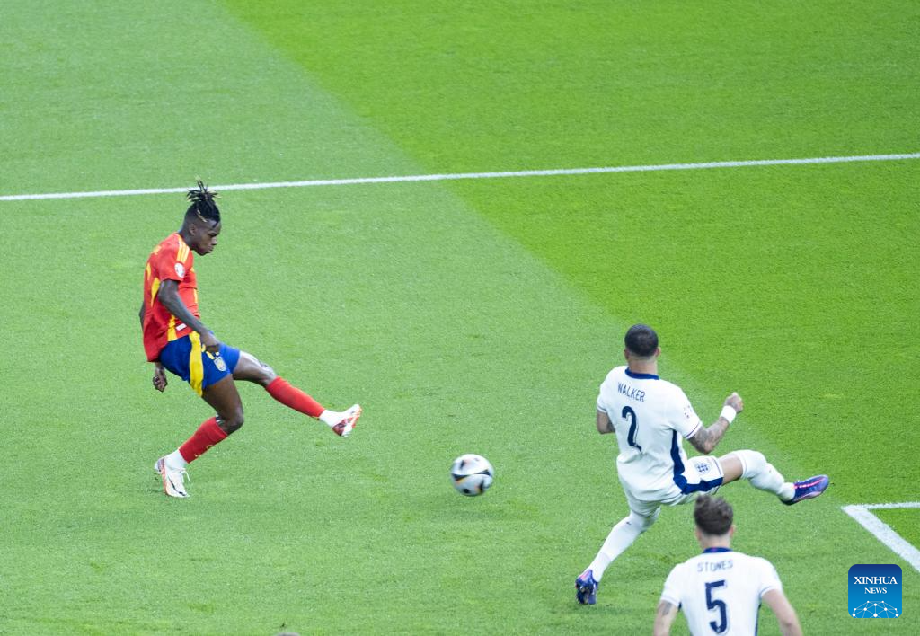 BERLIN, 15 julio, 2024 (Xinhua) -- Imagen del 14 de julio de 2024 de Nico Williams (i), de España, disparando y anotando, durante el partido correspondiente a la final de la EURO 2024 de la UEFA, entre Inglaterra y España, en Berlín, Alemania. (Xinhua/Bai Xuefei)