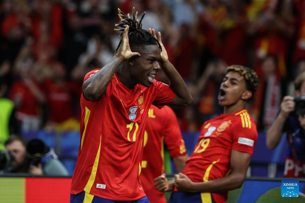 BERLIN, 15 julio, 2024 (Xinhua) -- Imagen del 14 de julio de 2024 de Nico Williams, de España, festejando su anotación durante el partido correspondiente a la final de la EURO 2024 de la UEFA, entre Inglaterra y España, en Berlín, Alemania. (Xinhua/Pan Yulong)