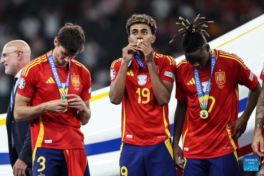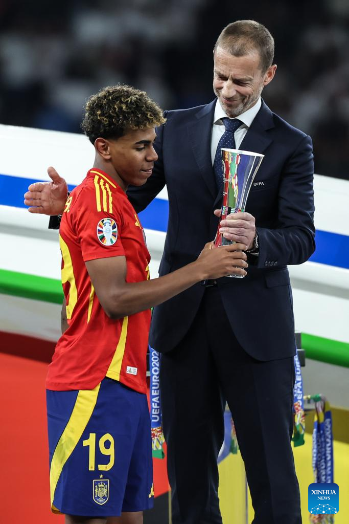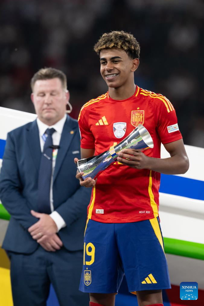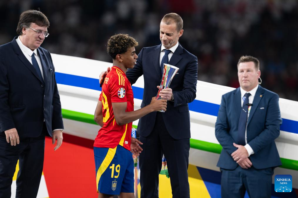 BERLIN, 15 julio, 2024 (Xinhua) -- Imagen del 14 de julio de 2024 de Lamine Yamal (2-i), de España, recibiendo el trofeo a Mejor Jugador Joven durante la ceremonia de premiación al término del partido correspondiente a la final de la EURO 2024 de la UEFA, entre Inglaterra y España, en Berlín, Alemania. (Xinhua/Xiao Yijiu)