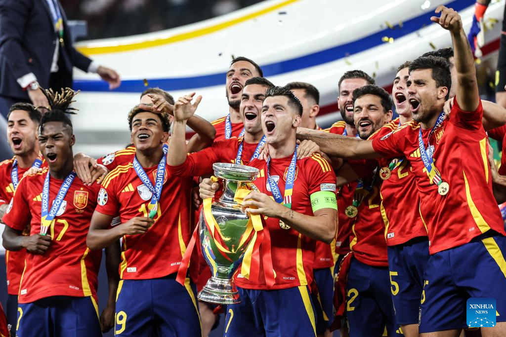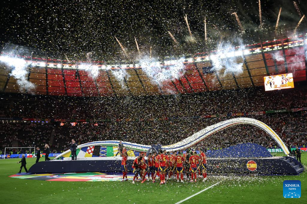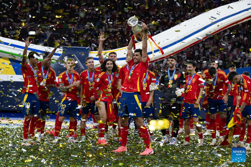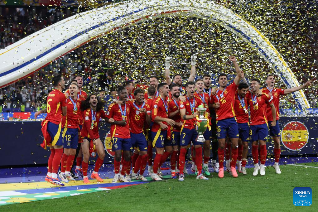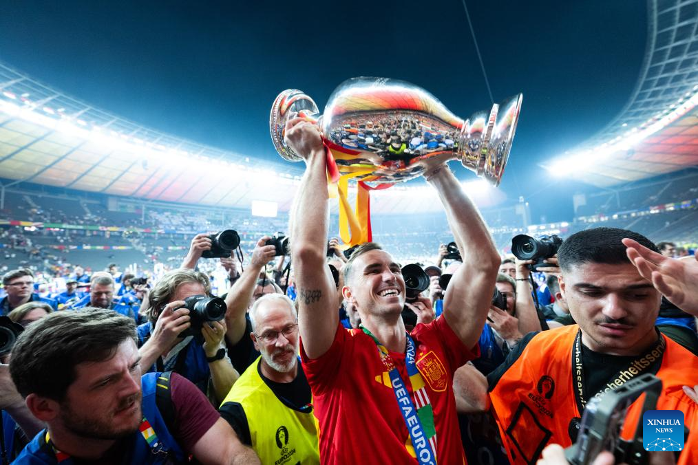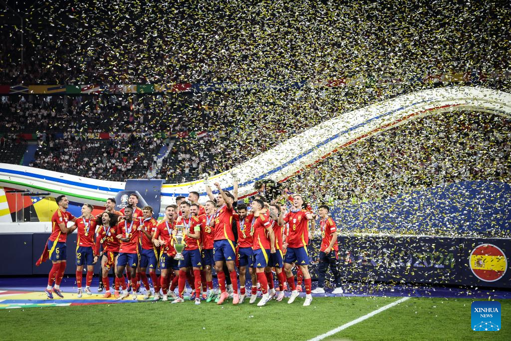 BERLIN, 15 julio, 2024 (Xinhua) -- Imagen del 14 de julio de 2024 de jugadores de España festejando la victoria al término del partido correspondiente a la final de la EURO 2024 de la UEFA, entre Inglaterra y España, en Berlín, Alemania. (Xinhua/Bai Xuefei)