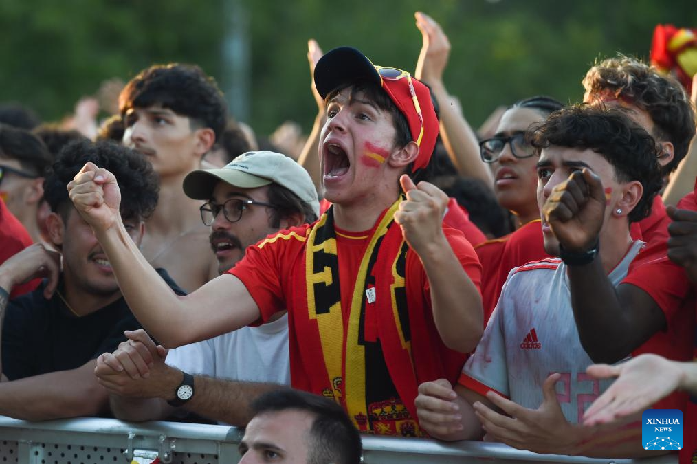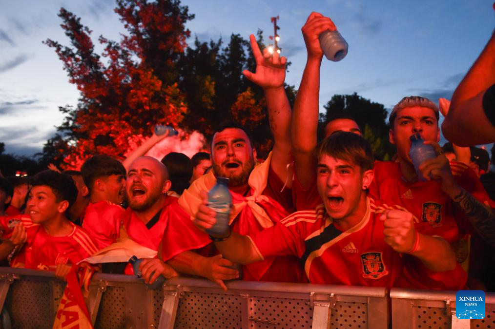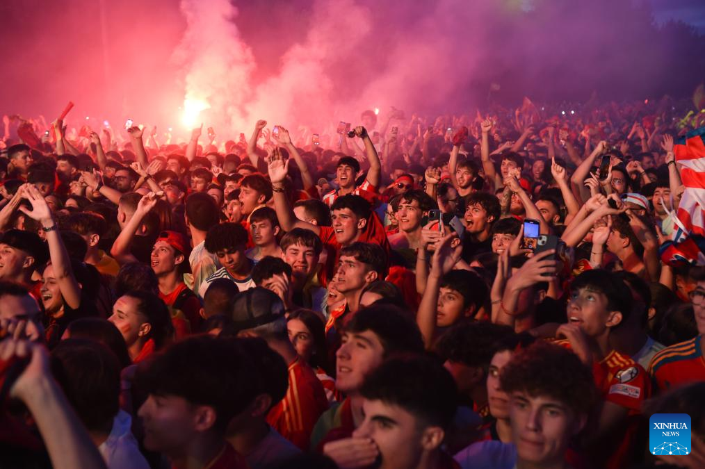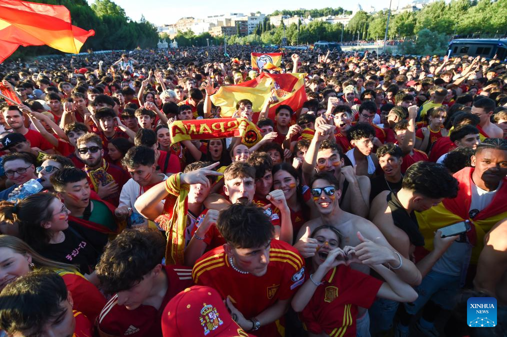 MADRID, 15 julio, 2024 (Xinhua) -- Imagen del 14 de julio de 2024 de aficionados de España celebrando mientras observan una transmisión en vivo del partido correspondiente a la final de la EURO 2024 de la UEFA, entre Inglaterra y España, en un área de visualización pública, en Madrid, España. (Xinhua/Gustavo Valiente)