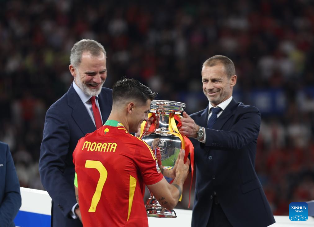 BERLIN, 15 julio, 2024 (Xinhua) -- Imagen del 14 de julio de 2024 de Alvaro Morata (c), de España, recibiendo el trofeo de parte del presidente de la UEFA, Aleksander Ceferin, durante la ceremonia de premiación al término del partido correspondiente a la final de la EURO 2024 de la UEFA, entre Inglaterra y España, en Berlín, Alemania. (Xinhua/Zhang Fan)