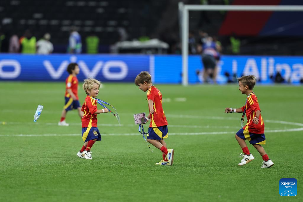 BERLIN, 15 julio, 2024 (Xinhua) -- Imagen del 14 de julio de 2024 de hijos de los jugadores de España jugando en el campo al término del partido correspondiente a la final de la EURO 2024 de la UEFA, entre Inglaterra y España, en Berlín, Alemania. (Xinhua/Pan Yulong)