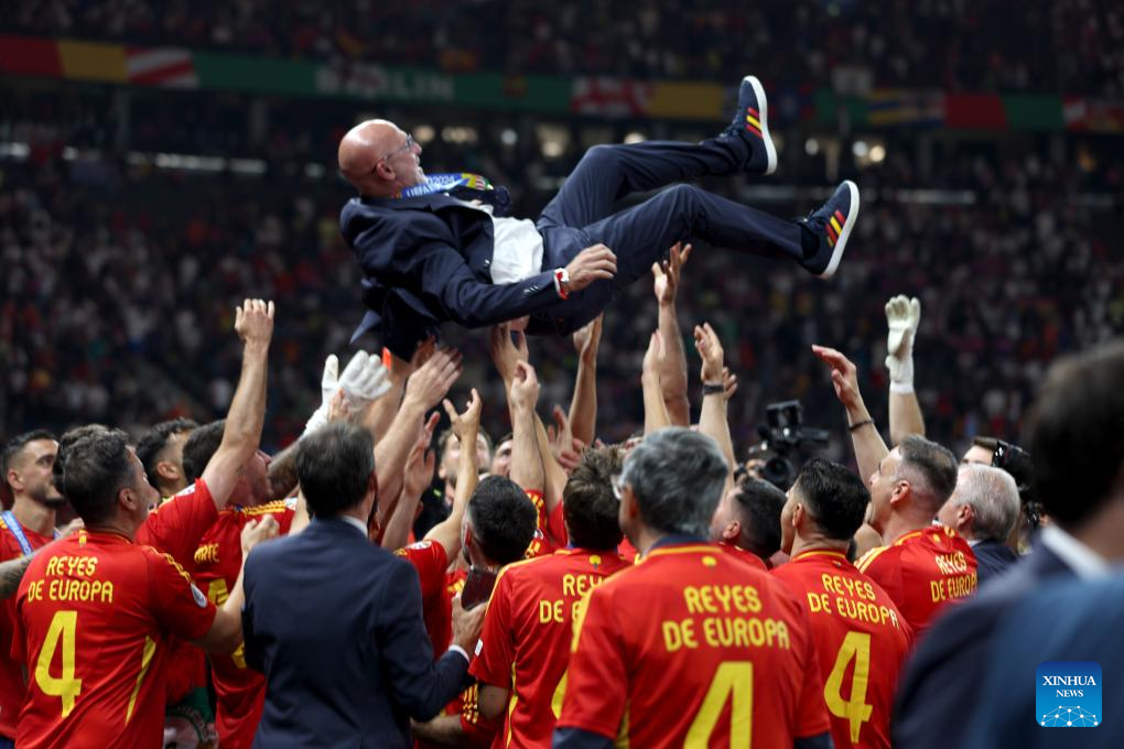 BERLIN, 15 julio, 2024 (Xinhua) -- Imagen del 14 de julio de 2024 del director técnico Luis de la Fuente, de España, siendo lanzado por los jugadores para festejar al término del partido correspondiente a la final de la EURO 2024 de la UEFA, entre Inglaterra y España, en Berlín, Alemania. (Xinhua/Zhang Fan)