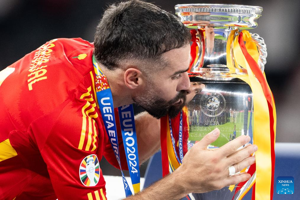 BERLIN, 15 julio, 2024 (Xinhua) -- Imagen del 14 de julio de 2024 de Daniel Carvajal, de España, besando el trofeo durante la ceremonia de premiación al término del partido correspondiente a la final de la EURO 2024 de la UEFA, entre Inglaterra y España, en Berlín, Alemania. (Xinhua/Xiao Yijiu)
