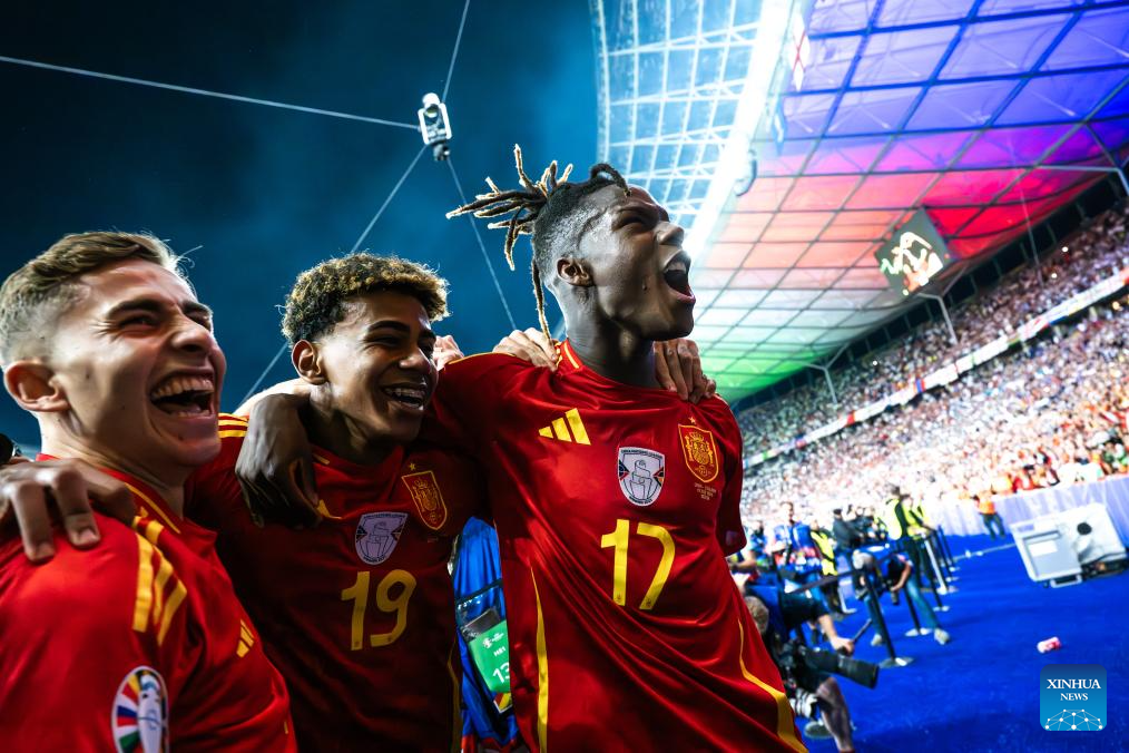 BERLIN, 15 julio, 2024 (Xinhua) -- Imagen del 14 de julio de 2024 de Nico Williams (d), y Lamine Yamal (c), de España, festejando al término del partido correspondiente a la final de la EURO 2024 de la UEFA, entre Inglaterra y España, en Berlín, Alemania. (Xinhua/Xiao Yijiu)