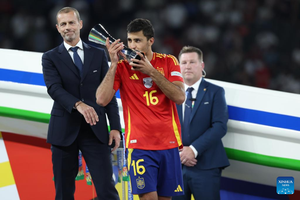 BERLIN, 15 julio, 2024 (Xinhua) -- Imagen del 14 de julio de 2024 de Rodri, de España, besando el trofeo a Mejor Jugador durante la ceremonia de premiación al término del partido correspondiente a la final de la EURO 2024 de la UEFA, entre Inglaterra y España, en Berlín, Alemania. (Xinhua/Pan Yulong)