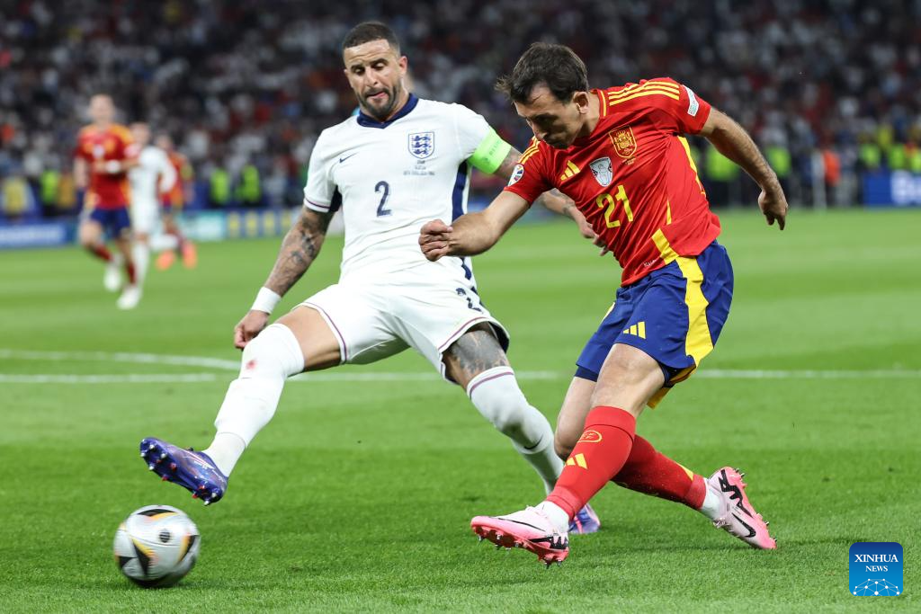 BERLIN, 15 julio, 2024 (Xinhua) -- Imagen del 14 de julio de 2024 de Mikel Oyarzabal (d), de España, disputando el balón con Kyle Walker, de Inglaterra, durante el partido correspondiente a la final de la EURO 2024 de la UEFA, entre Inglaterra y España, en Berlín, Alemania. (Xinhua/Pan Yulong)