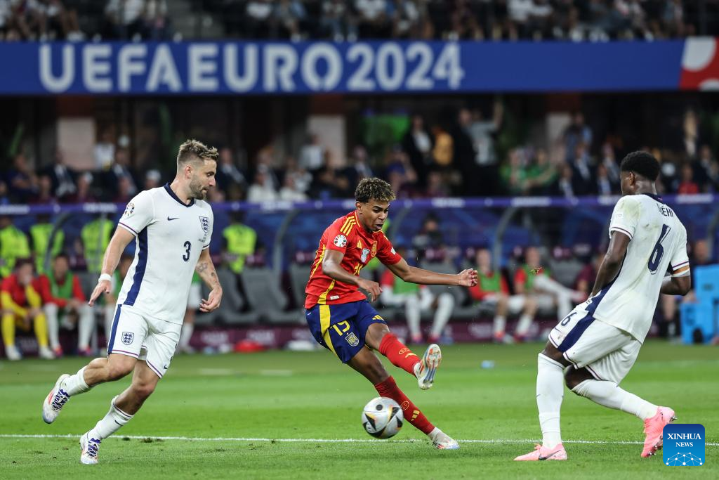 BERLIN, 15 julio, 2024 (Xinhua) -- Imagen del 14 de julio de 2024 de Lamine Yamal (c), de España, disparando durante el partido correspondiente a la final de la EURO 2024 de la UEFA, entre Inglaterra y España, en Berlín, Alemania. (Xinhua/Pan Yulong)