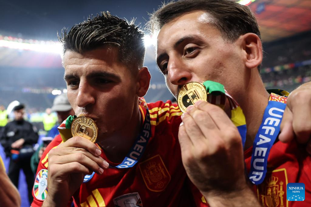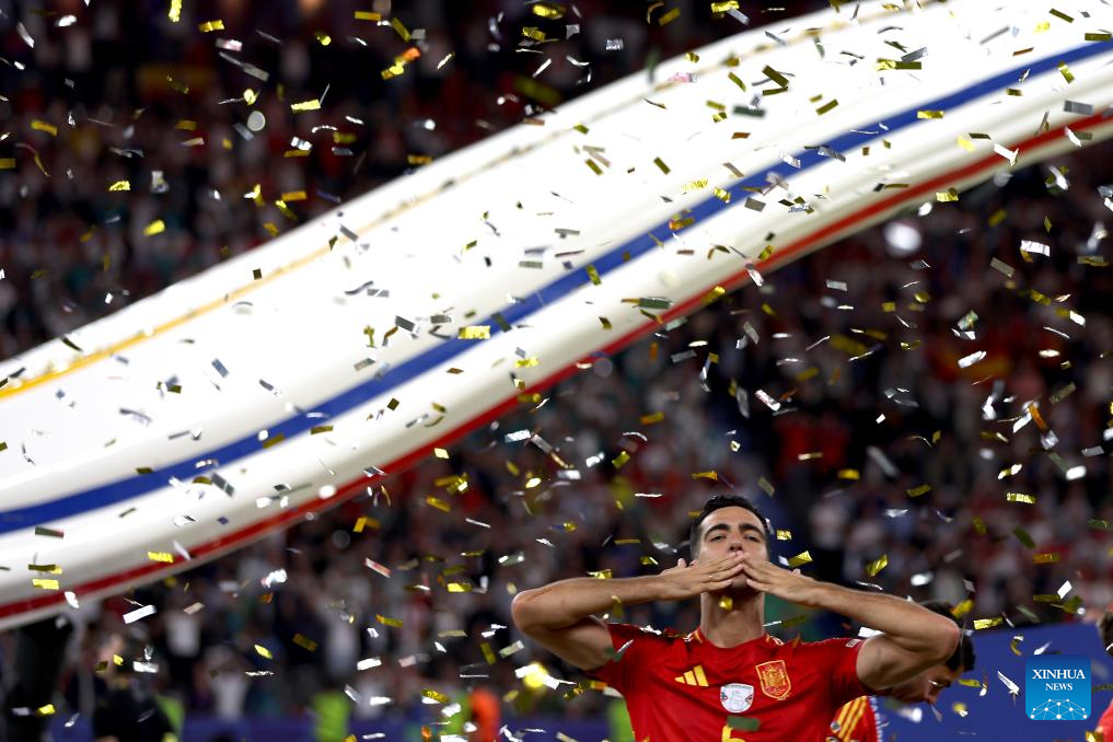 BERLIN, 15 julio, 2024 (Xinhua) -- Imagen del 14 de julio de 2024 de Mikel Merino, de España, festejando durante la ceremonia de premiación al término del partido correspondiente a la final de la EURO 2024 de la UEFA, entre Inglaterra y España, en Berlín, Alemania. (Xinhua/Zhang Fan)