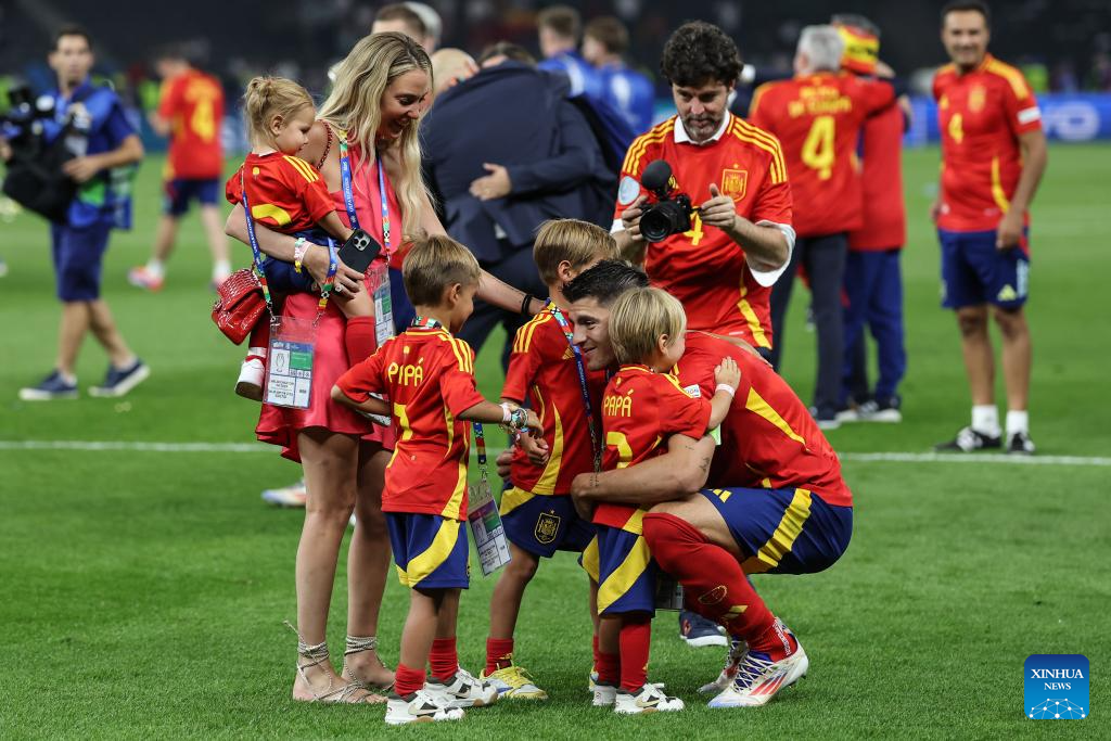 BERLIN, 15 julio, 2024 (Xinhua) -- Imagen del 14 de julio de 2024 de Alvaro Morata (d-frente), de España, festejando con su esposa e hijos al término del partido correspondiente a la final de la EURO 2024 de la UEFA, entre Inglaterra y España, en Berlín, Alemania. (Xinhua/Pan Yulong)