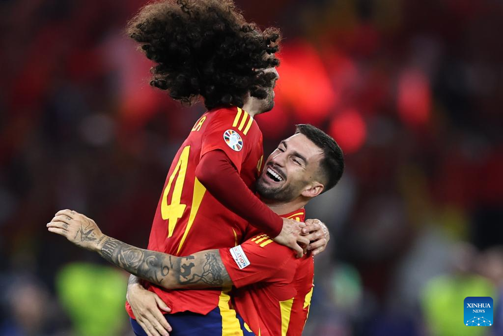BERLIN, 15 julio, 2024 (Xinhua) -- Imagen del 14 de julio de 2024 de Marc Cucurella (i), de España, festejando con Alex Baena al término del partido correspondiente a la final de la EURO 2024 de la UEFA, entre Inglaterra y España, en Berlín, Alemania. (Xinhua/Zhang Fan)