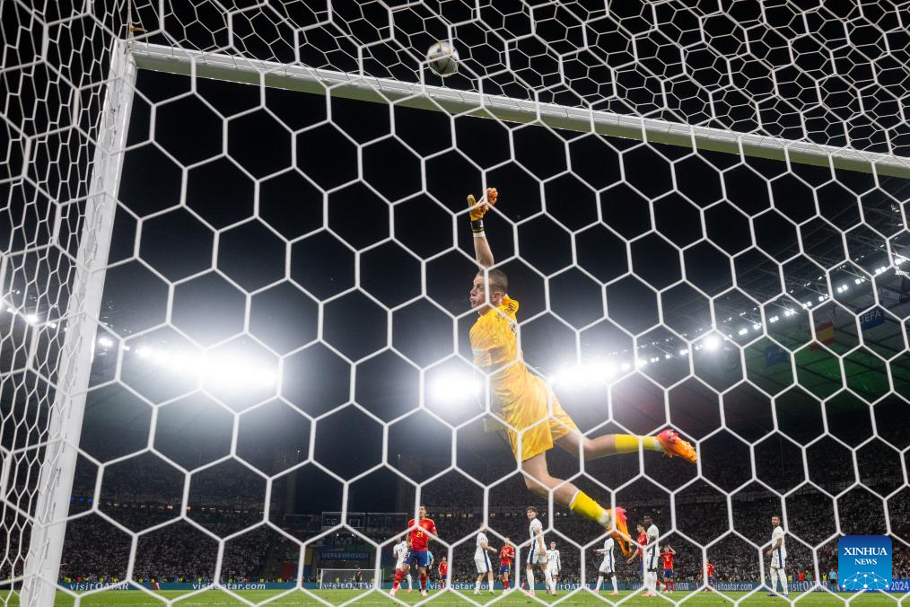 BERLIN, 15 julio, 2024 (Xinhua) -- Imagen del 14 de julio de 2024 del guardameta Jordan Pickford, de Inglaterra, realizando una atajada durante el partido correspondiente a la final de la EURO 2024 de la UEFA, entre Inglaterra y España, en Berlín, Alemania. (Xinhua/Xiao Yijiu)