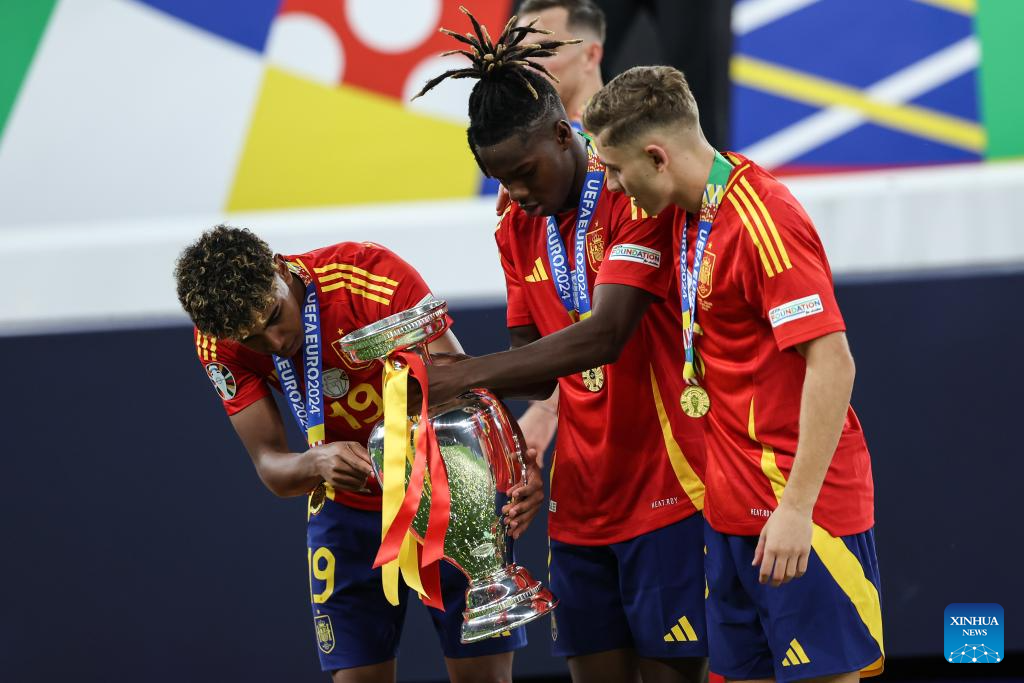 BERLIN, 15 julio, 2024 (Xinhua) -- Imagen del 14 de julio de 2024 de Lamine Yamal (c), Nico Williams (d), y Robin Le Normand, de España, festejando durante la ceremonia de premiación al término del partido correspondiente a la final de la EURO 2024 de la UEFA, entre Inglaterra y España, en Berlín, Alemania. (Xinhua/Pan Yulong)