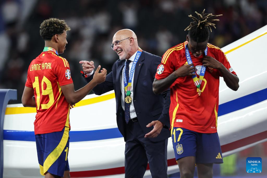 BERLIN, 15 julio, 2024 (Xinhua) -- Imagen del 14 de julio de 2024 del director técnico, Luis de la Fuente (c), hablando con Lamine Yamal durante la ceremonia de premiación al término del partido correspondiente a la final de la EURO 2024 de la UEFA, entre Inglaterra y España, en Berlín, Alemania. (Xinhua/Pan Yulong)