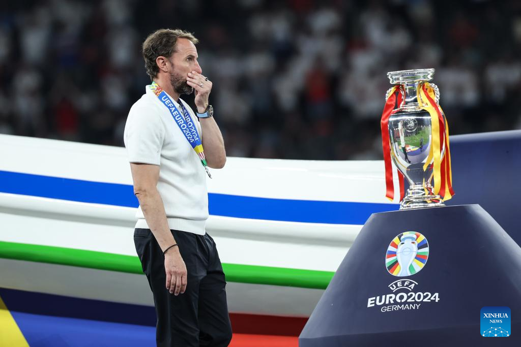 BERLIN, 15 julio, 2024 (Xinhua) -- Imagen del 14 de julio de 2024 del director técnico, Gareth Southgate de Inglaterra, caminando frente al trofeo durante la ceremonia de premiación al término del partido correspondiente a la final de la EURO 2024 de la UEFA, entre Inglaterra y España, en Berlín, Alemania. (Xinhua/Pan Yulong)