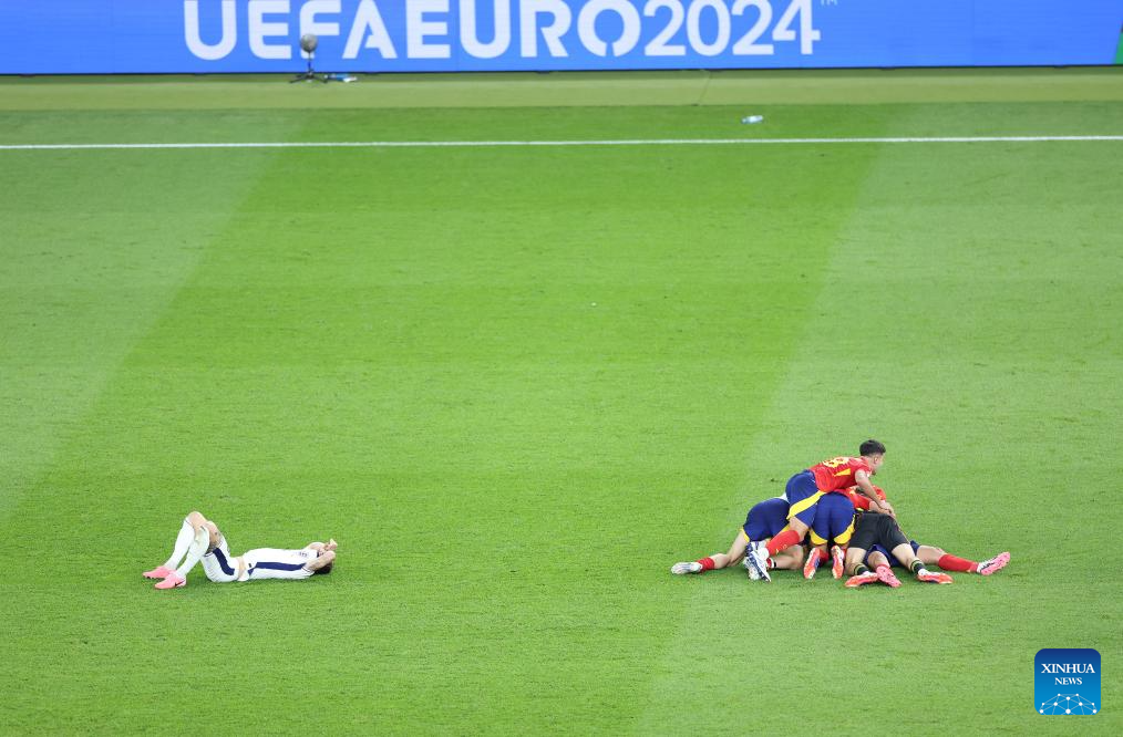 BERLIN, 15 julio, 2024 (Xinhua) -- Imagen del 14 de julio de 2024 de jugadores de España festejando al término del partido correspondiente a la final de la EURO 2024 de la UEFA, entre Inglaterra y España, en Berlín, Alemania. (Xinhua/Pan Yulong)
