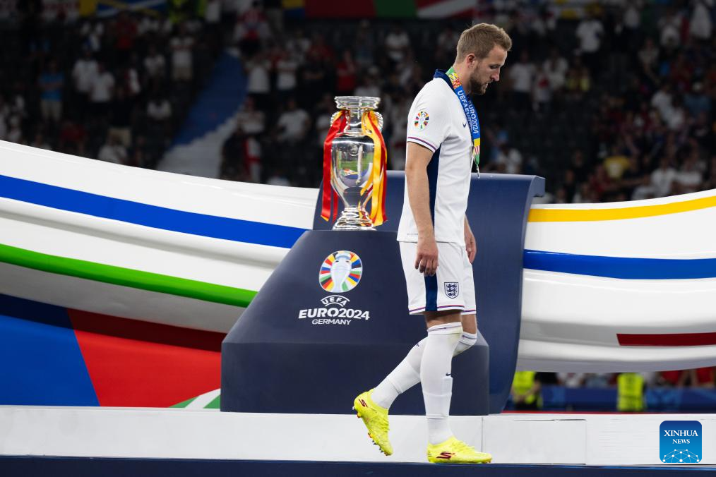 BERLIN, 15 julio, 2024 (Xinhua) -- Imagen del 14 de julio de 2024 de Harry Kane, de Inglaterra, portando su medalla de plata mientras camina frente al trofeo durante la ceremonia de premiación al término del partido correspondiente a la final de la EURO 2024 de la UEFA, entre Inglaterra y España, en Berlín, Alemania. (Xinhua/Xiao Yijiu)