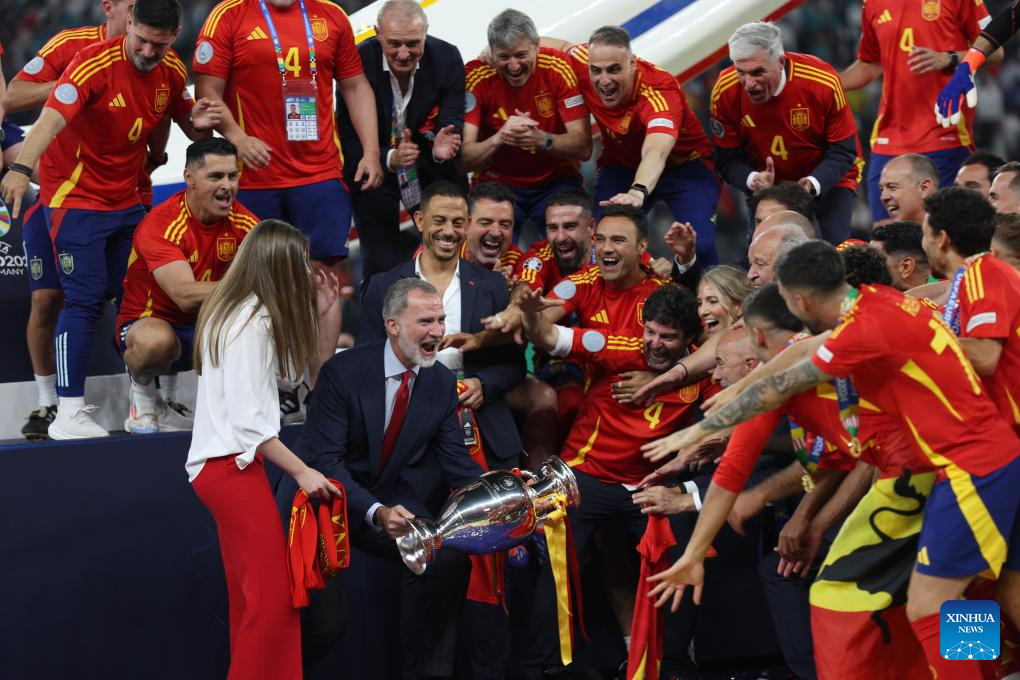 BERLIN, 15 julio, 2024 (Xinhua) -- Imagen del 14 de julio de 2024 del rey Felipe VI (2-i-frente), de España, sosteniendo el trofeo y festejando con el equipo de España durante la ceremonia de premiación al término del partido correspondiente a la final de la EURO 2024 de la UEFA, entre Inglaterra y España, en Berlín, Alemania. (Xinhua/Zhang Fan)