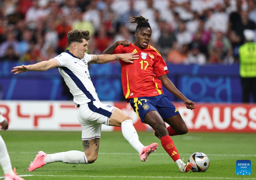 BERLIN, 15 julio, 2024 (Xinhua) -- Imagen del 14 de julio de 2024 de Nico Williams (d), de España, disputando el balón durante el partido correspondiente a la final de la EURO 2024 de la UEFA, entre Inglaterra y España, en Berlín, Alemania. (Xinhua/Zhang Fan)