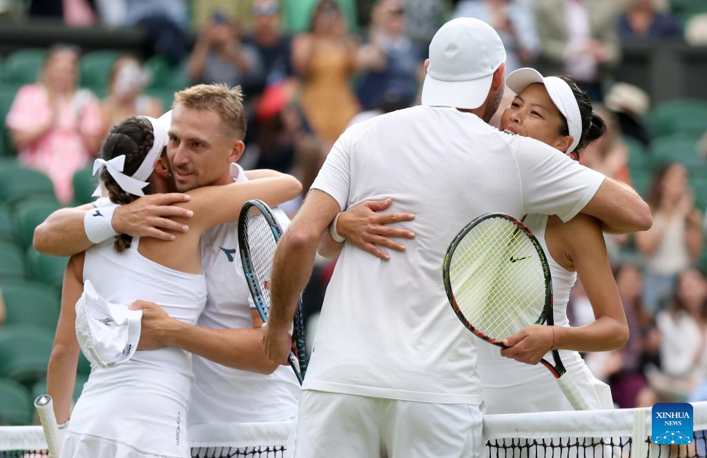 LONDRES, 15 julio, 2024 (Xinhua) -- Imagen del 14 de julio de 2024 de Jan Zielinski (2-i)/Hsieh Su-Wei (d), saludando a Santiago González (2-d)/Giuliana Olmos después del partido de la final de dobles mixtos entre Santiago González/Giuliana Olmos, de México, y Jan Zielinski (Polonia)/Hsieh Su-Wei (Taipei de China), en el Campeonato de Tenis de Wimbledon, en Londres, Reino Unido. (Xinhua/Li Ying)