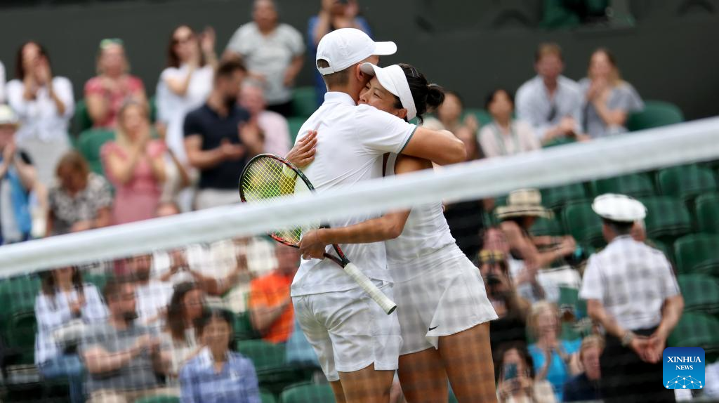 LONDRES, 15 julio, 2024 (Xinhua) -- Imagen del 14 de julio de 2024 de Jan Zielinski (i)/Hsieh Su-Wei festejando después de ganar el partido de la final de dobles mixtos entre Santiago González/Giuliana Olmos, de México, y Jan Zielinski (Polonia)/Hsieh Su-Wei (Taipei de China), en el Campeonato de Tenis de Wimbledon, en Londres, Reino Unido. (Xinhua/Li Ying)
