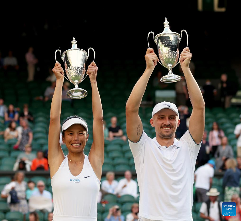 LONDRES, 15 julio, 2024 (Xinhua) -- Imagen del 14 de julio de 2024 de Jan Zielinski (d)/Hsieh Su-Wei levantando sus trofeos en la ceremonia de premiación después de ganar el partido de la final de dobles mixtos entre Santiago González/Giuliana Olmos, de México, y Jan Zielinski (Polonia)/Hsieh Su-Wei (Taipei de China), en el Campeonato de Tenis de Wimbledon, en Londres, Reino Unido. (Xinhua/Li Ying)