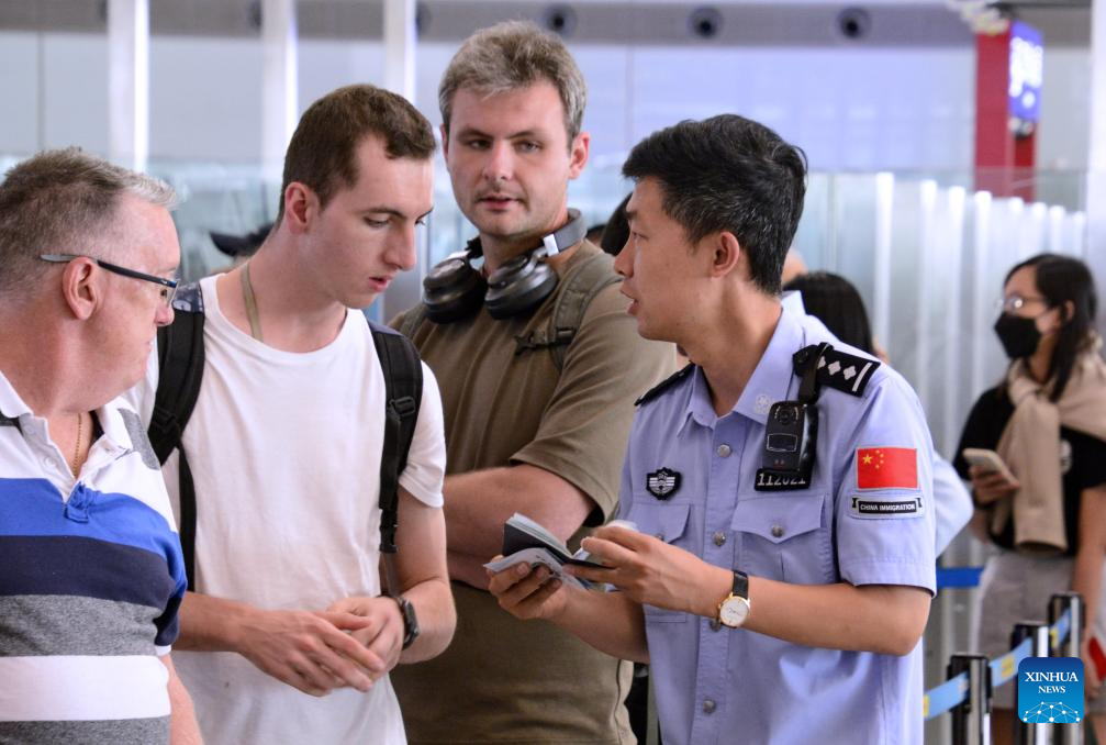 BEIJING, 16 julio, 2024 (Xinhua) -- Imagen del 10 de julio de 2024 de un oficial de policía respondiendo preguntas sobre los permisos de entrada sin visado para pasajeros extranjeros en la sección de control fronterizo del Aeropuerto Internacional Capital de Beijing, en Beijing, capital de China. (Xinhua/Li Xin)